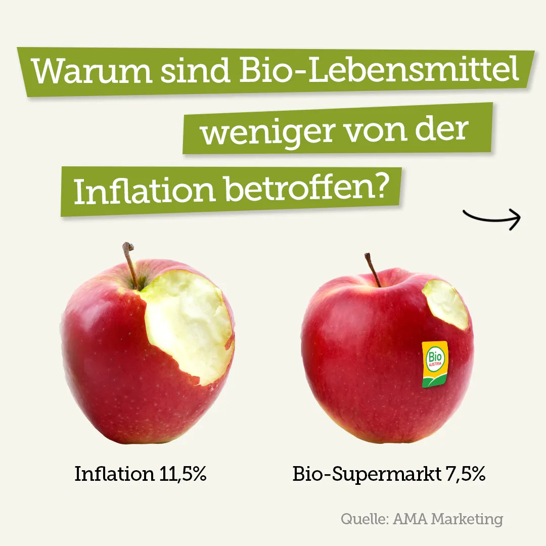 Die Inflation in Österreich betrifft immer mehr Warengruppen des täglichen Gebrauchs, auch Lebensmittel. Während sich vor allem Produkte aus dem Niedrigpreissegment stark verteuert haben, ist der Preis von Bio-Produkten deutlich weniger angestiegen. Sie bieten aufgrund ihrer Nachhaltigkeit und Ressourcenschonung langfristig stabile Preise und tragen damit zur Bekämpfung der Inflation bei. Abgesehen davon verursachen sie viel weniger Klima-, Umwelt- und Gesundheitsschäden, welche in Zukunft noch weitere, sehr hohe, Kosten bedeuten.